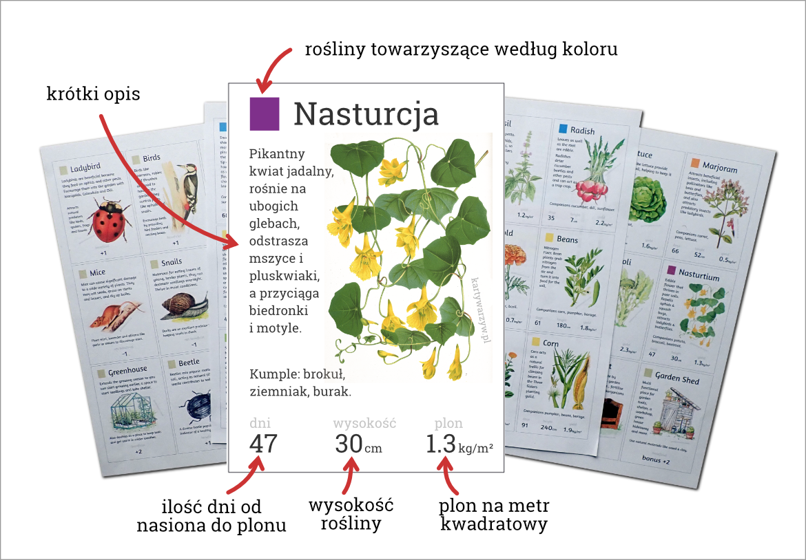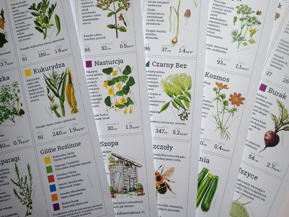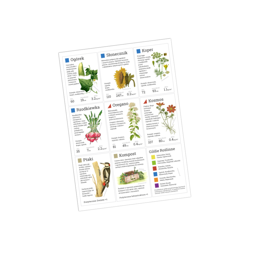 1 arkusz pdf A4 = 9 kart, w tym 6 kart roślin, 2 karty specjalne (ptaki, kompost) + jedna karta z kluczem.